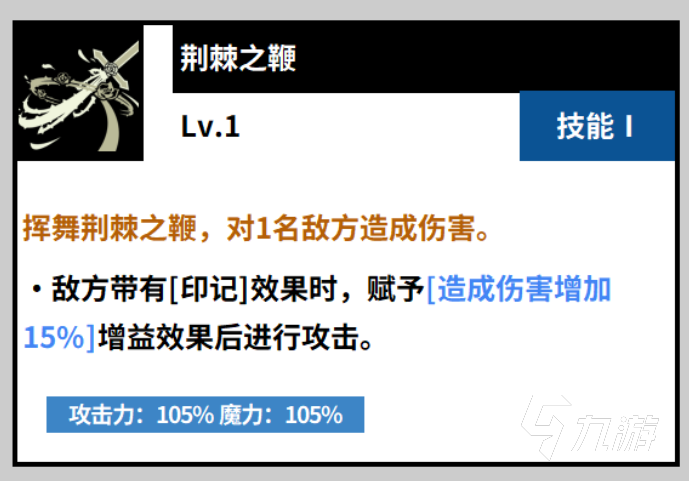 技能1,荆棘之鞭,挥舞荆棘之鞭,对一名敌人造成伤害。敌方带有印记效果时,赋予造成伤害增加15%的伤害之后释放攻击,等于变相增加伤害;技能2,以隆起的荆棘,对敌方全体造成伤害,赋予对方防御减少两回合的DEBUFF,50%的概率,赋予敌方EBUFF效果,2个回合的持续效果。