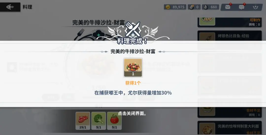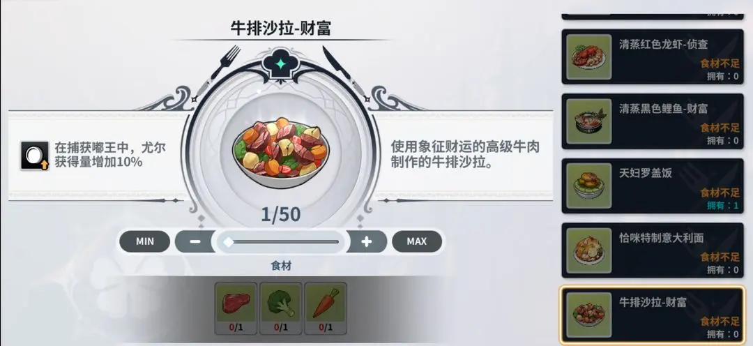 「牛排系列」料理的Buff效果是增加「捕获嘟王」中获得的尤尔数量: