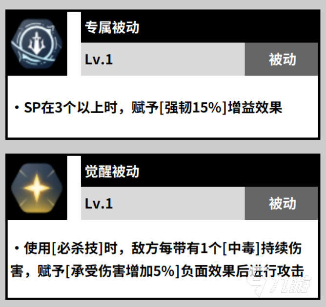 被动效果两个,专属的被动可以在SP为三个及以上的时候赋予15%的强韧效果,觉醒之后每次使用必杀技的时候,对方每有一个中毒的DEBUFF效果,给角色赋予5%的增伤效果,再叠加一波中毒效果之后,就能快速提升角色的实力,为玩家的伤害增加爆发伤害。