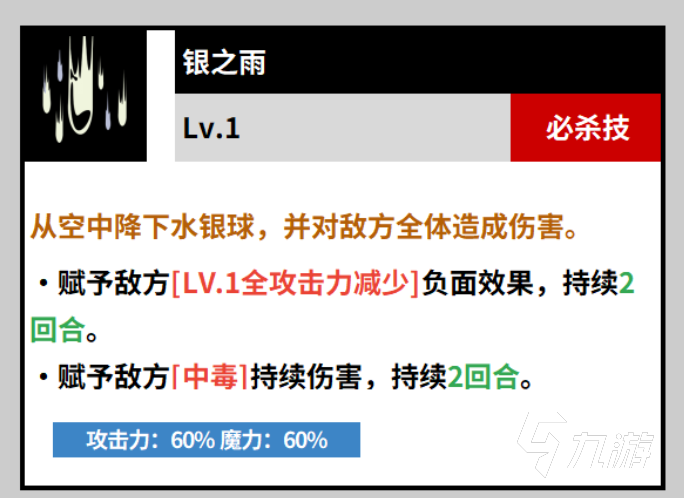 银之雨是角色的最终大招,能够将敌人的全体攻击效果下降一,继续叠加中毒的效果,本身的伤害不是很高,但是在敌人的中毒效果叠加的足够之后,造成的伤害搭配中毒的持续输出可以说是非常的强力了,对于很多玩家来说如果玩毒队,该角色绝对是上毒的核心。