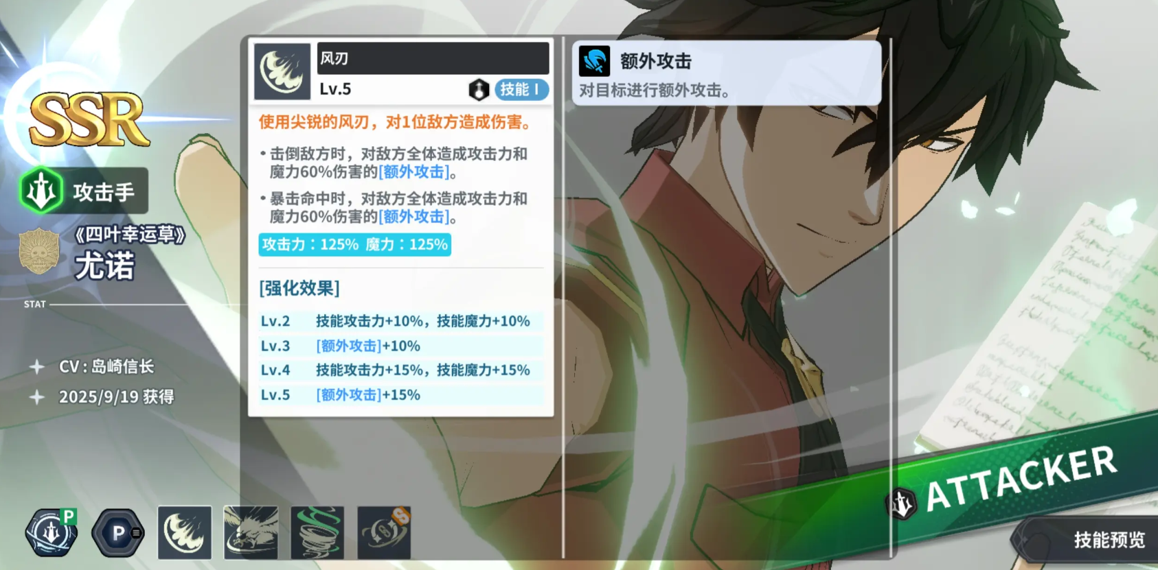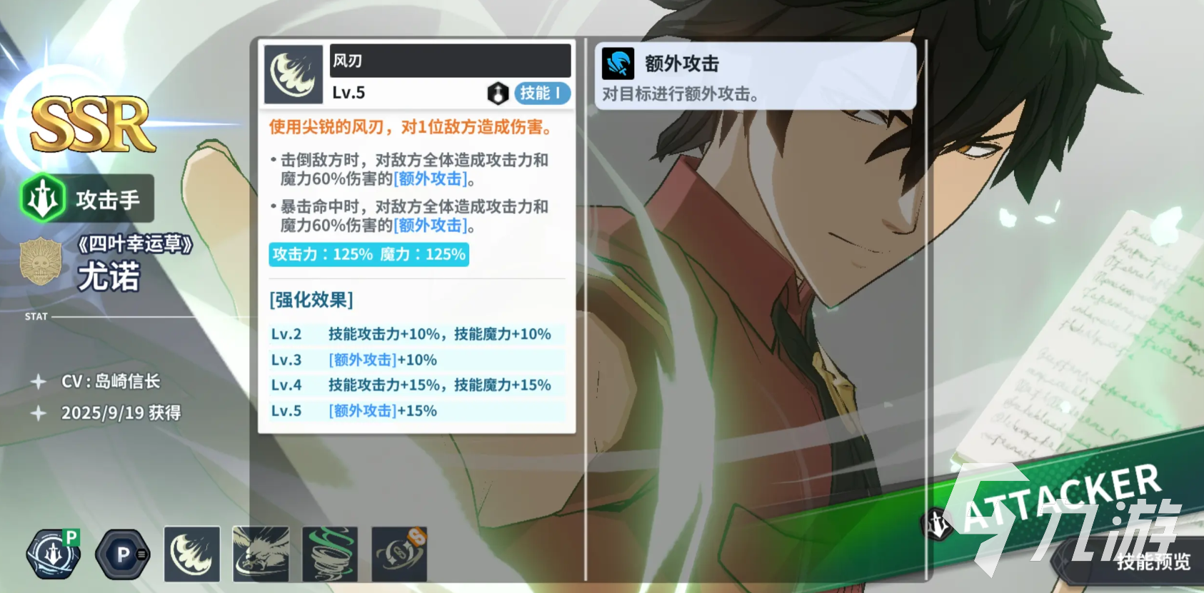 尤诺是攻击手,他的风刃会使用尖锐的风刃对1名敌人造成伤害,成功将其击倒或者暴击命中时会对全体敌人进行一次额外攻击,他的被动能在战斗开始时,让攻击力最高的敌人进入技能沉默一回合,他的必杀会制造龙卷风对全部敌人造成伤害,并赋予敌方承受伤害量增加的减益。