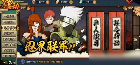 火影忍者手游忍界联军怎么打?怎么过关?在完成单人模式以后怎么完成联合模式?需要注意什么?接下来就让我们一起来看看吧。 火影忍者手游忍界联军过关攻略 活动介绍...[详情]