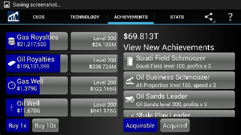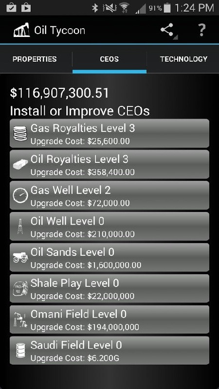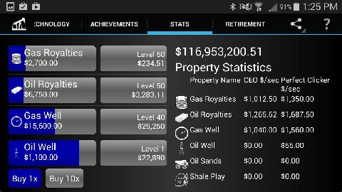 In this incremental or idle game, you can build your oil empire as you see fit.Increase your investments, invest in new technologies, even retire and pass on your knowledge to your protégé.At higher levels, don't miss the specialists:* The Investment Advisor slowly buys property levels for you. * The Efficiency Manager gives a periodic boost to the speed of one of your properties.* The Consultant gives the income from one property a massive boost for a short time.Features:* Designed for tablets and phones.* Fun and simple.* Great for when you only have a few minutes to play.* Hundreds of upgrades and achievements mean you always have something to look forward to.Billing Permission: We have added the billing permission to allow those who wish to do so to remove the ads. We do not intend to add any further transactions to the game.