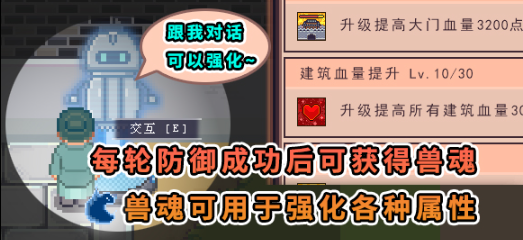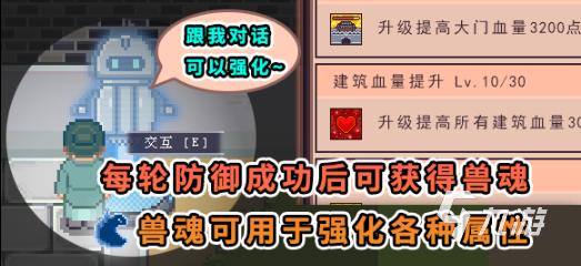防御工事如炮塔、大门等可以在天机庙中解锁,兽潮目前总共会有40波的进攻,每波进攻还会被分成几轮小关,新手可以在江城城门口找到NPC小叽,和他对话不经能了解一些兽潮的相关事项,还能对建筑进行升级。
