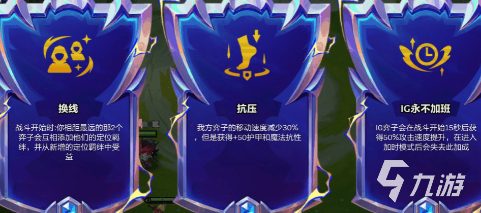 抗压能让我方棋子移速减少30%,但获得50护甲和魔法抗性,新玩法整个牌库目前只有4只队伍的冠军皮肤卡,牌库每回合也只有4个卡位,并且不存在选秀,抢装备与棋子的回合。