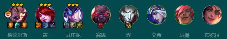 二、阵容羁绊:4 征服者3 艾欧尼亚3 诺克萨斯2 弗雷尔卓德2 主宰2 格斗家