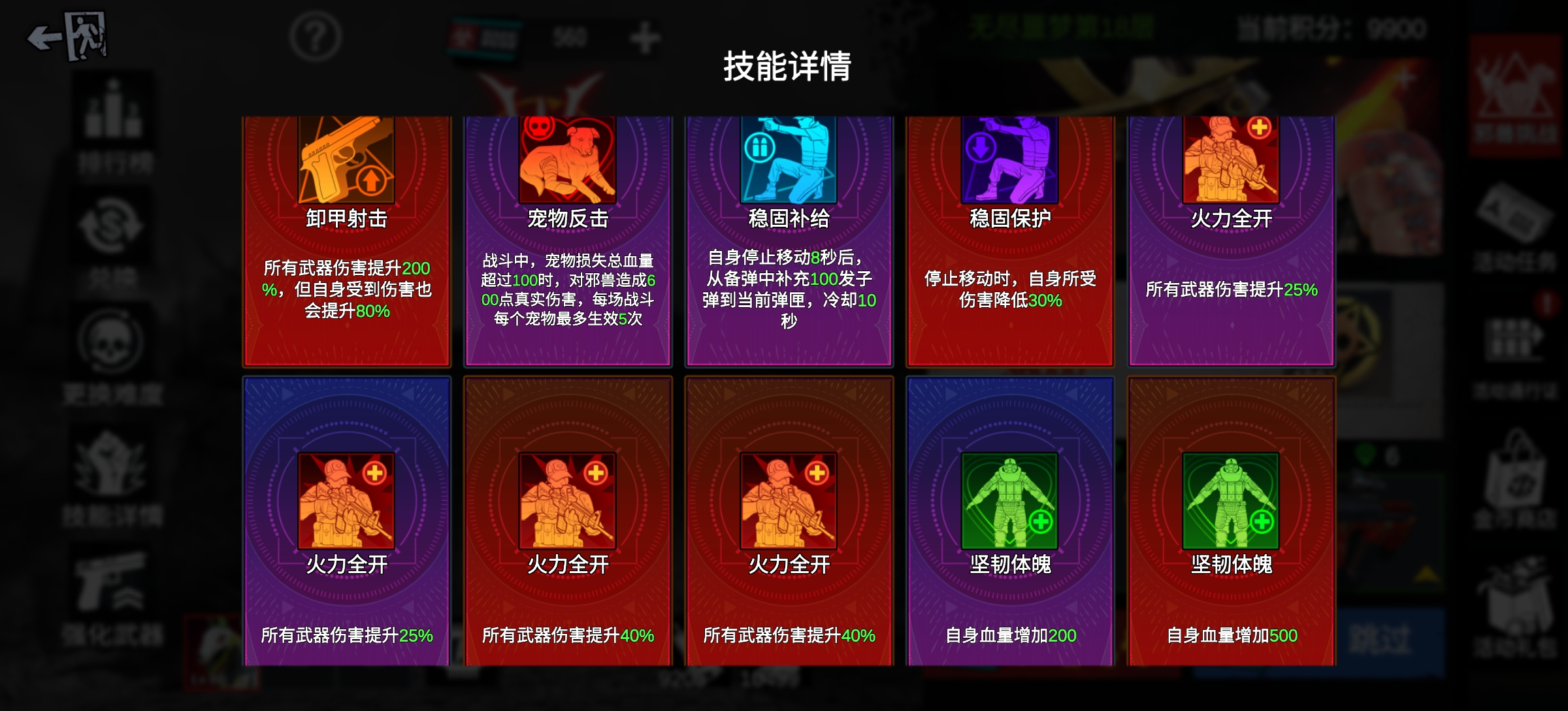 3、每轮挑战过程中,每过一层可获得一次选择技能机会,此技能加成本轮挑战一直有效,重新开始后则清空。技能加成效果极大,众多技能效果不一,会产生各类无法预料结果。可以在技能详情中查看当前已获得的技能。