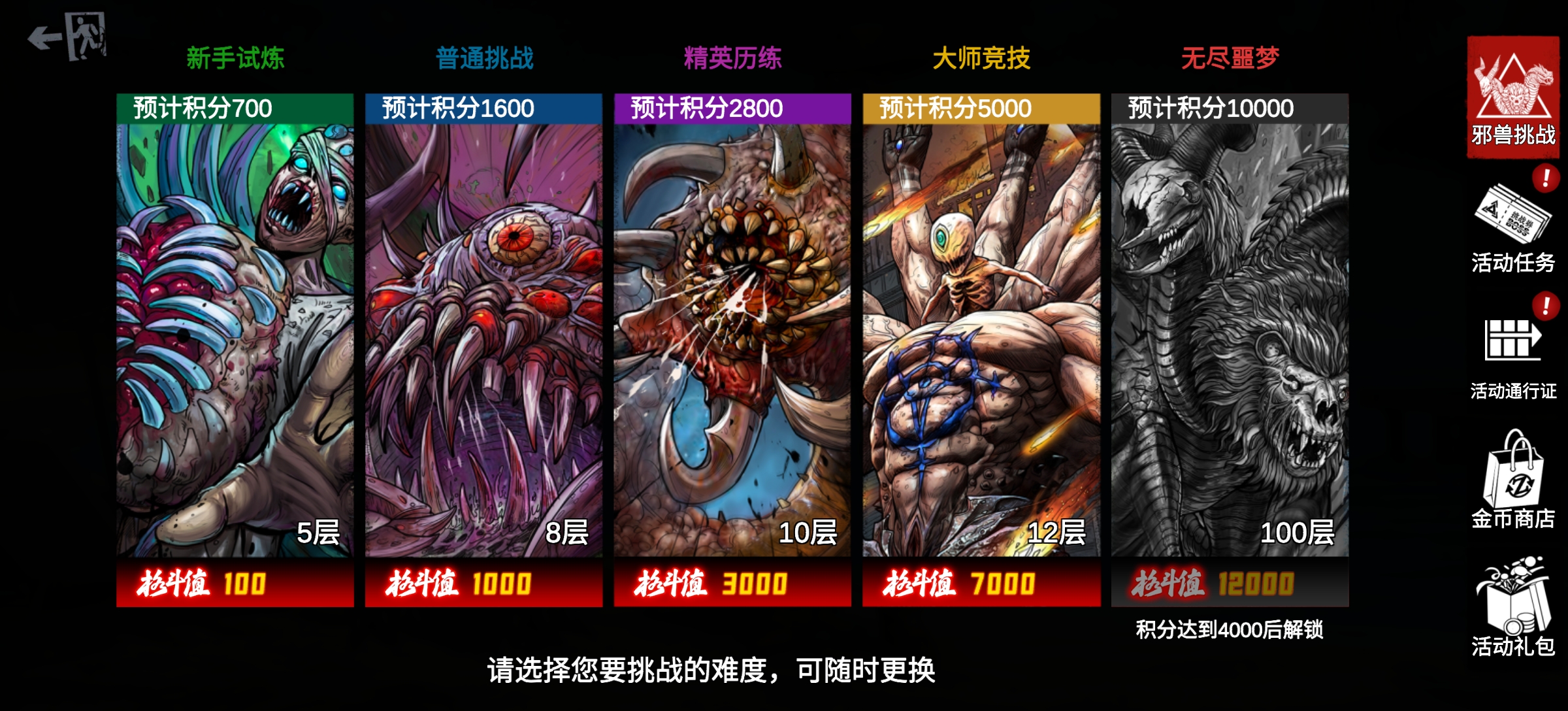 2、一共分为5个难度,其中最高无尽噩梦难度需要先在大师难度中获得4000积分以上才能解锁。不同积分影响排行和奖励兑换的开启。每轮挑战都有5次外部复活机会,强退不扣次数但损失门票。此设定与狩猎玩法相同。