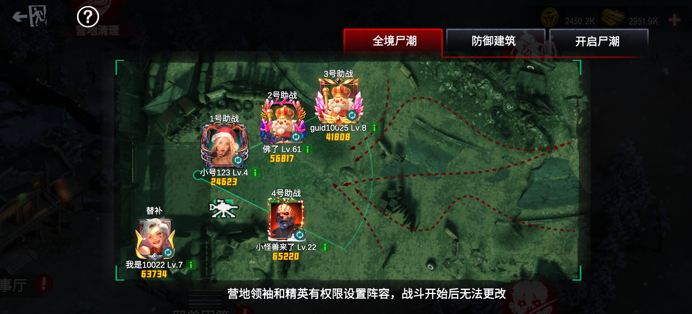 挑战使用1+4模式,自己为主战可正常操作,其余4人为营地固定助战成员,由管理在开赛前指定,每次战斗均可用且没有次数限制。假设自己是2号助战,那么自己在挑战时,将启用替补成员作为2号助战参与战斗。所有助战数据和营地尸潮互通,直接读取营地普通尸潮的武器配置参与战斗,营地防御设施均可用。