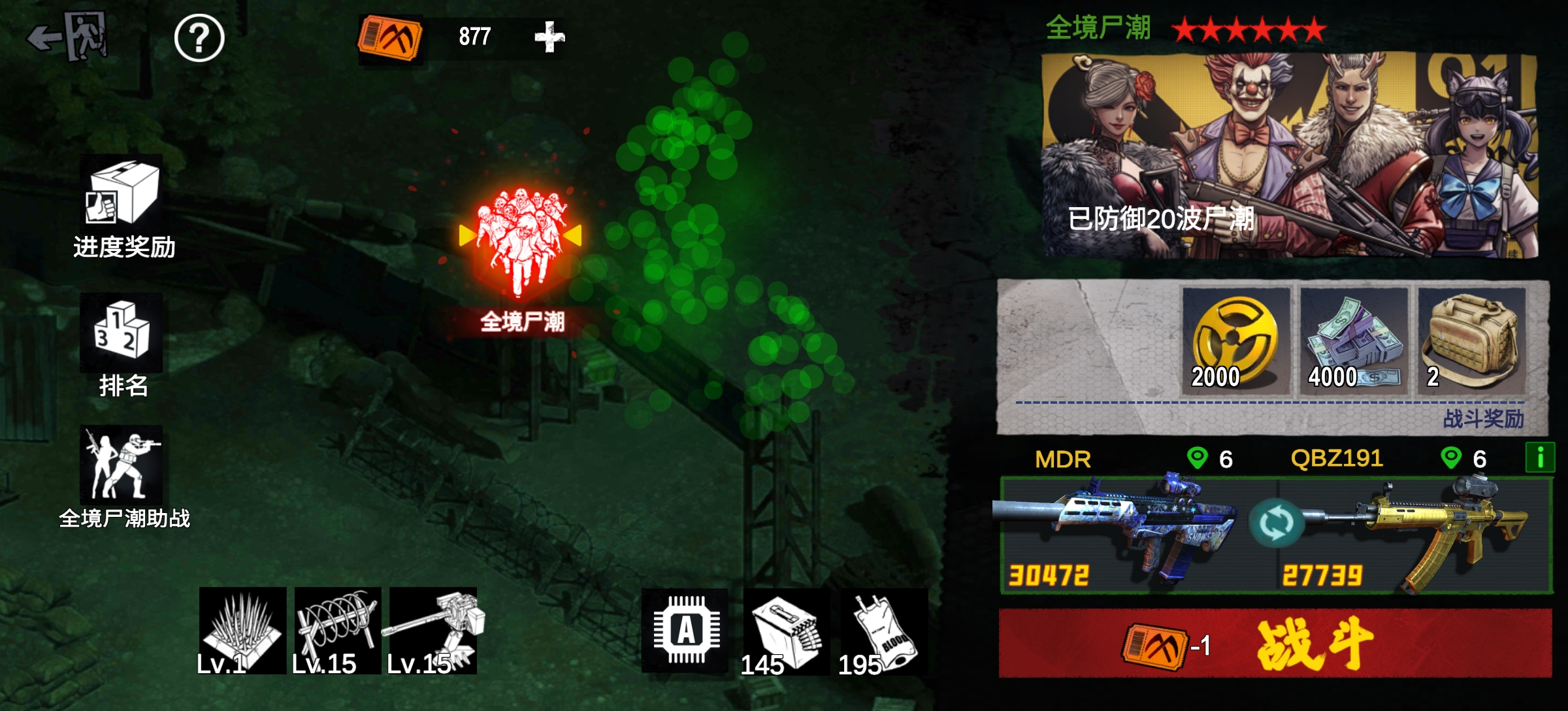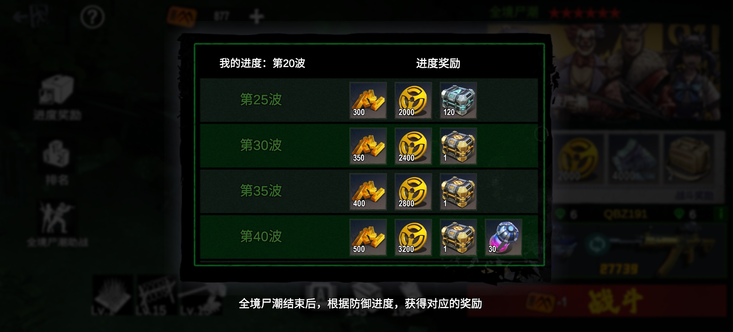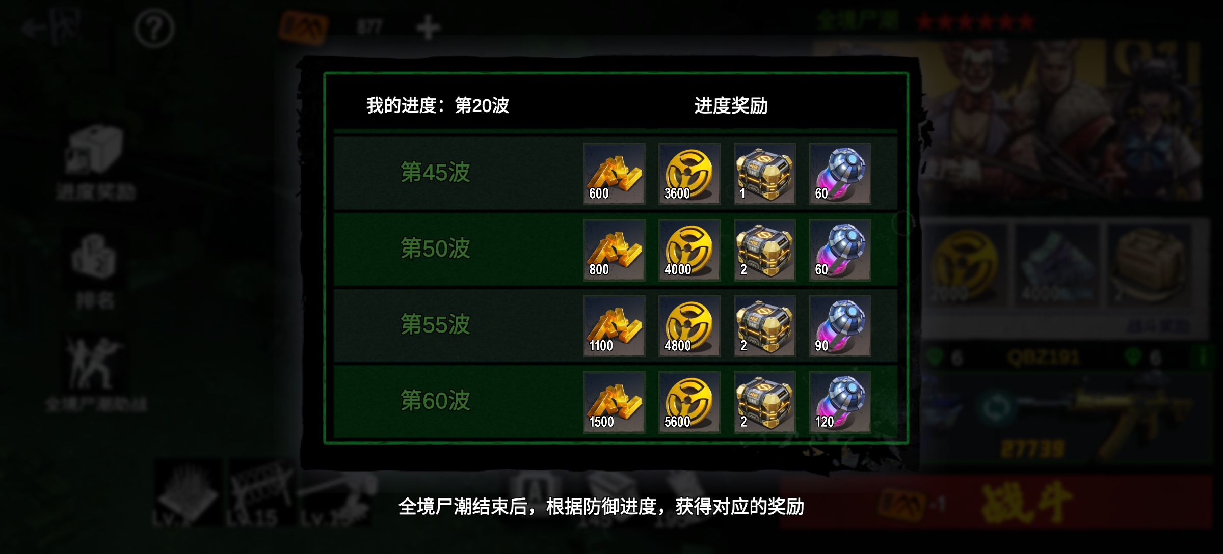 第三为全服奖励,根据本次尸潮全服最高波次,给全服所有玩家发放一份奖励,无论是否参与战斗均可获得。