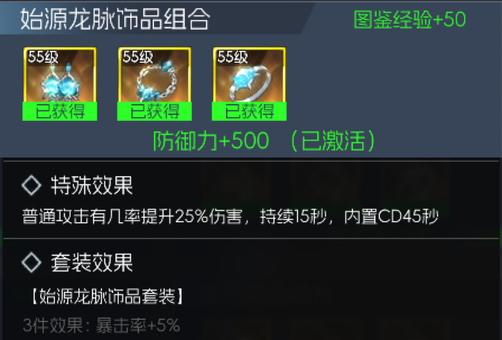 该套装基础属性属于55级金色饰品中的第二档,套装属性增加10%攻击力,特殊效果提高攻速,能够丝滑提升输出效率和总伤数值,对于输出职业来说是一套性价比较高的强力装备。