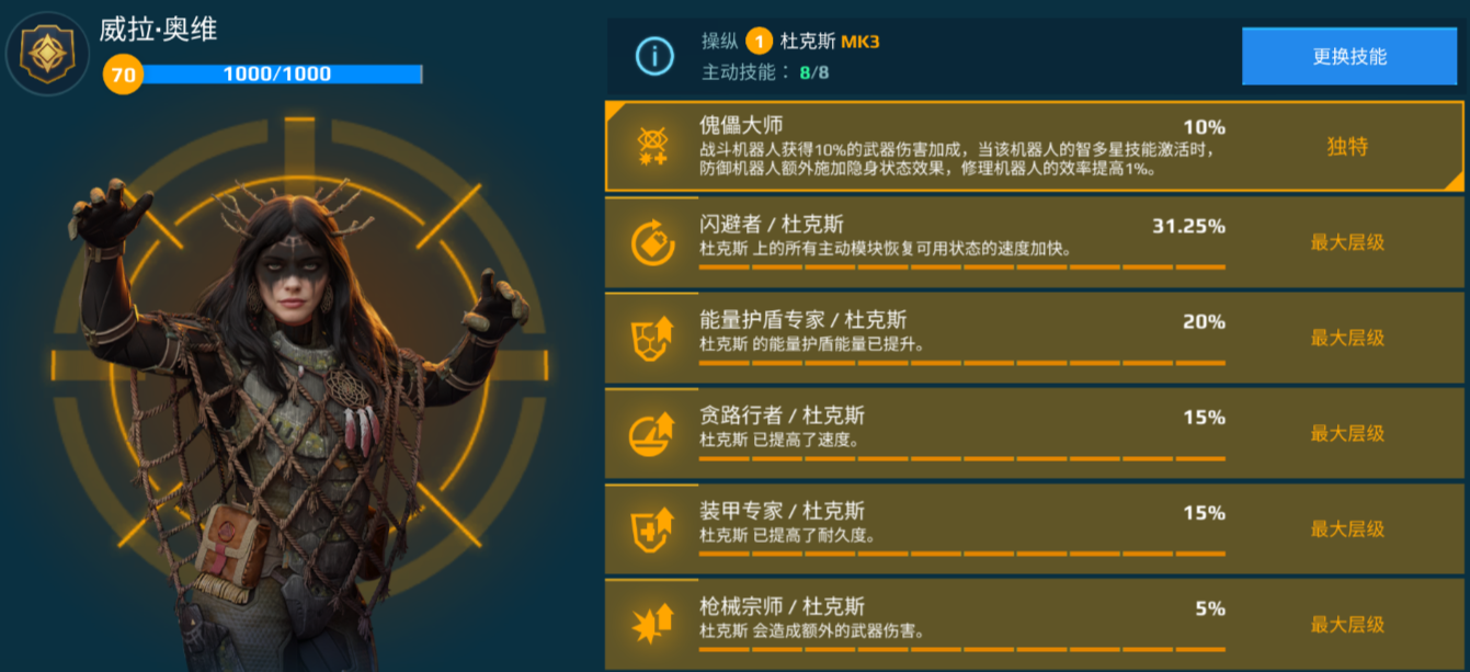 生存方面,[杜克斯] 除了能获得防御机器人的宙斯盾与修理机器人的治疗加持,还可通过专属机师 [威拉・奥维] 的技能 “傀儡大师” 进入隐身状态,同时战斗机器人的武器伤害与修理机器人的治疗效率也会得到小额提升。