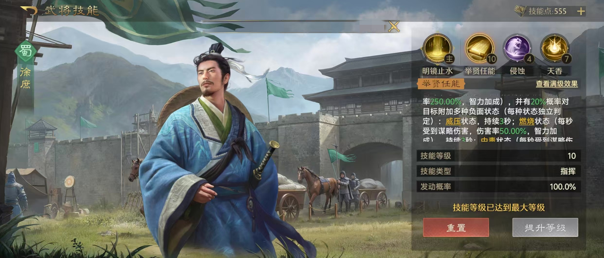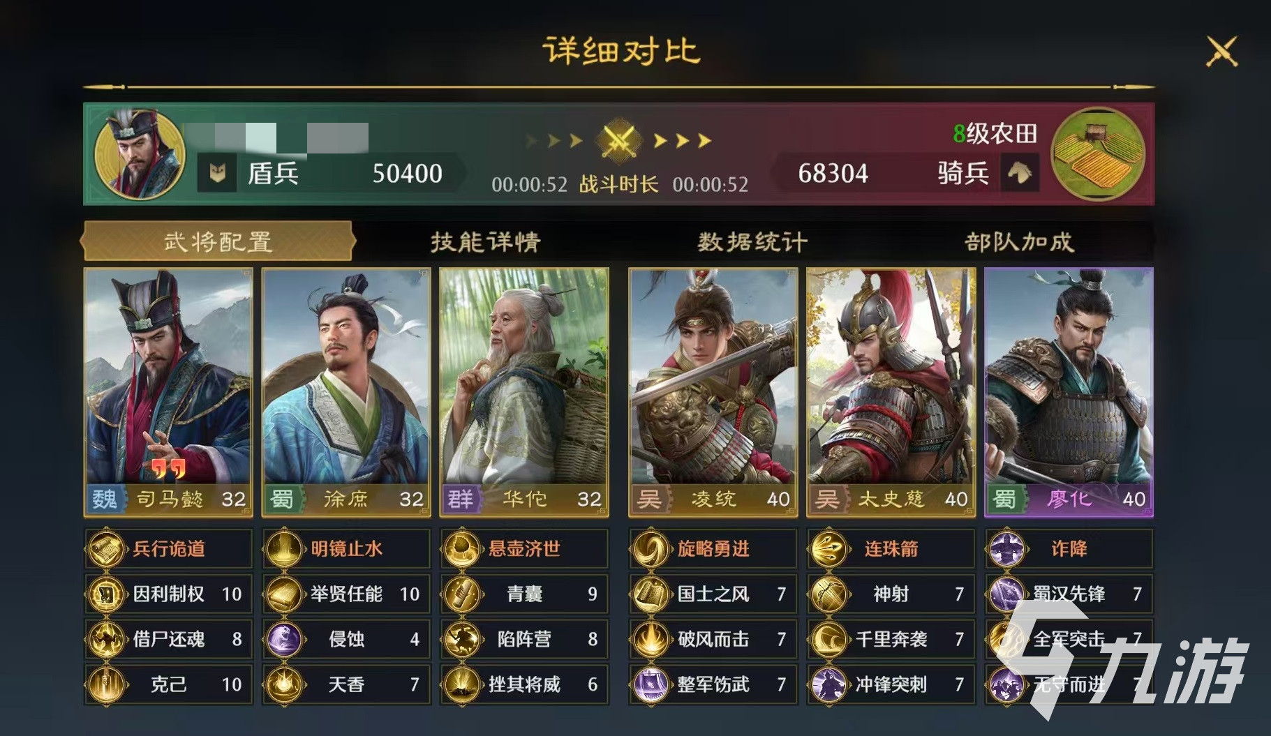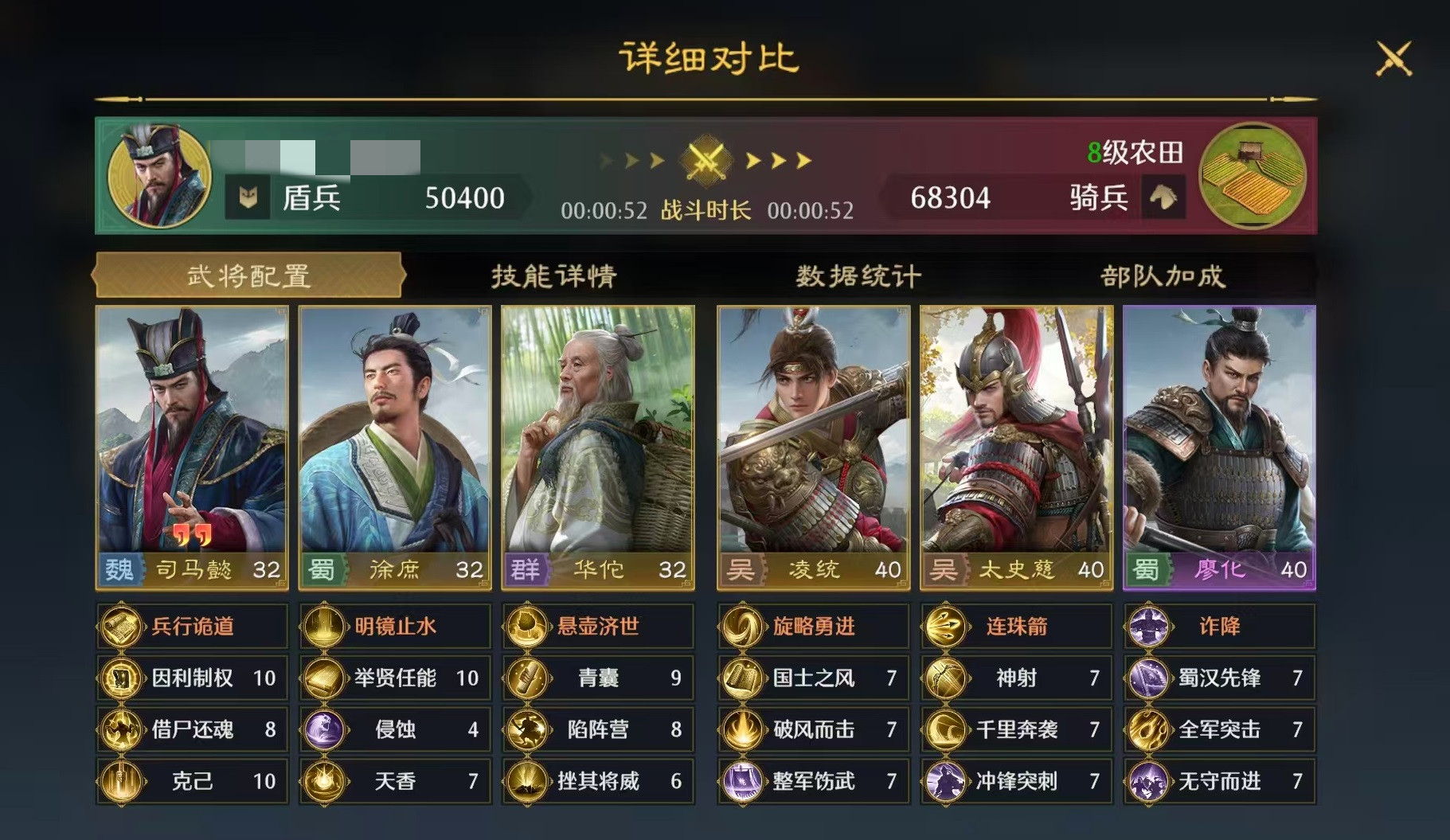 另外一套阵容选择的武将是周瑜、华佗和司马懿。周瑜作为主将,携带的技能是火乘风势和火蛇飞焰,主要的是附加点火和输出。司马懿放在二号位,利用技能借尸还魂和蚀骨,这次不选择侵蚀是为了避免过长的CD影响中毒的覆盖。华佗是三号位,带上天香依然是保证整体的生存。核心机制是采用周瑜和司马懿的双C路线,这样能够避免单一中毒输出比较慢的问题,兵种方面全部达到了S盾兵,有额外的属性加成,同样可以站稳脚跟。