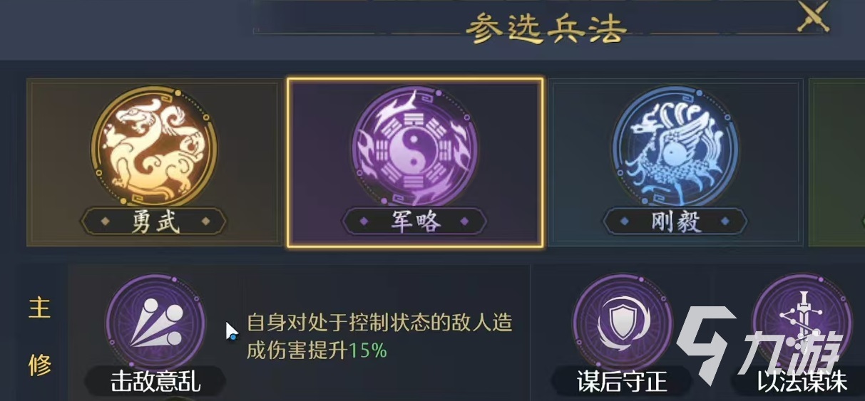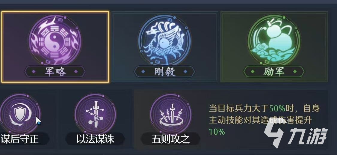 诸葛亮的兵法优先选择军略派系,适配其无策的输出和控制核心,当然不同的阵容搭配也会有细节方面的调整,接下来小编以诸葛亮的几个主流搭配来详细介绍。如果选择的是刘备、关羽和诸葛亮的阵容,那么诸葛亮的兵法就主修军略里面的五则攻之,目的是强化主动技能的输出,辅助可以搭配上雷霆、集气、善谋等,用雷霆去提升自身的谋略伤害,用集气加快技能循环节奏,用善谋来进一步提升智力属性,也是为了增加输出。