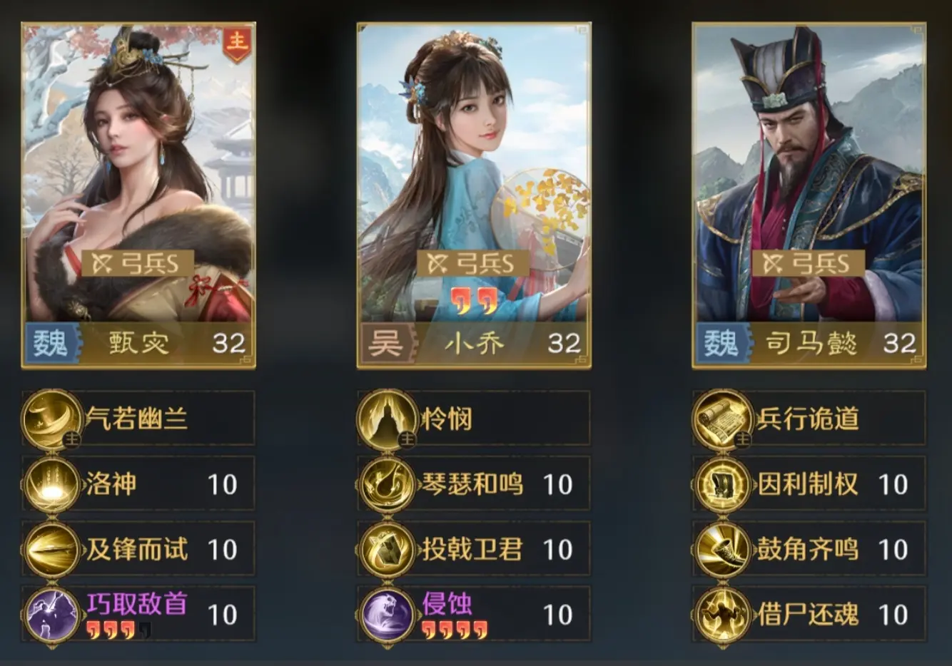 群雄阵营的有袁绍,吕绮玲和公孙瓒,袁绍少于造成范围伤害,提升统帅,吕绮玲的武力伤害比较高,威压好,公孙瓒善于提升自身伤害,属于越战越勇的类型。