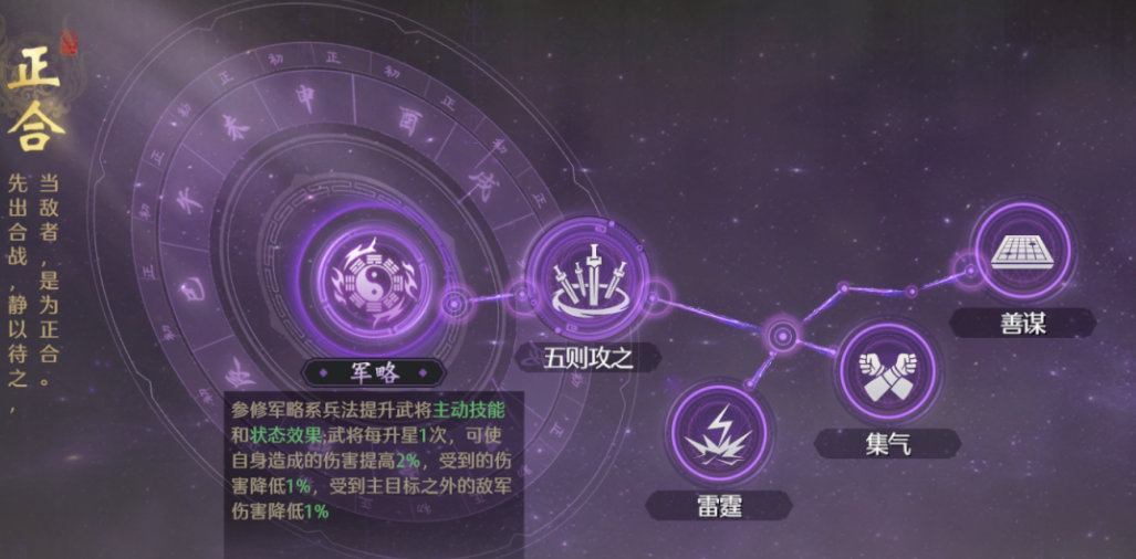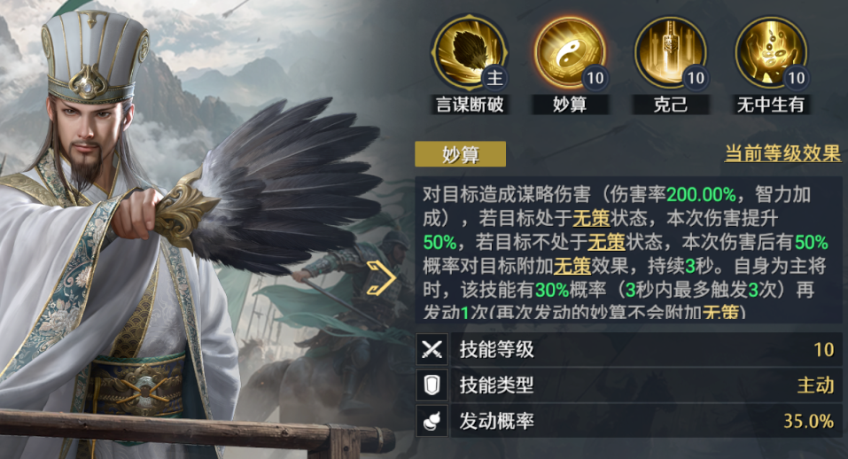 无策的效果就类似沉默,可以让对方无法释放技能,再搭配克己和无中生有,克己有80点的智力加成,而无中生有也能完美助力妙算和克己,额外8%的发动率加成,并且有8%的主动技能伤害加成。