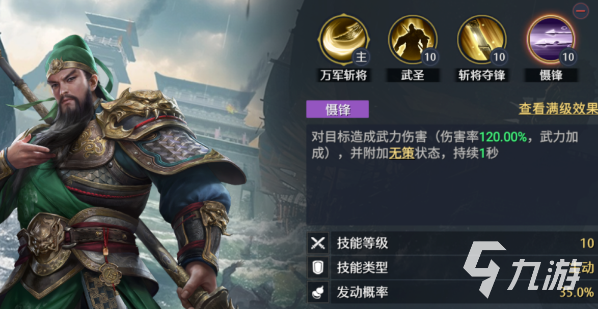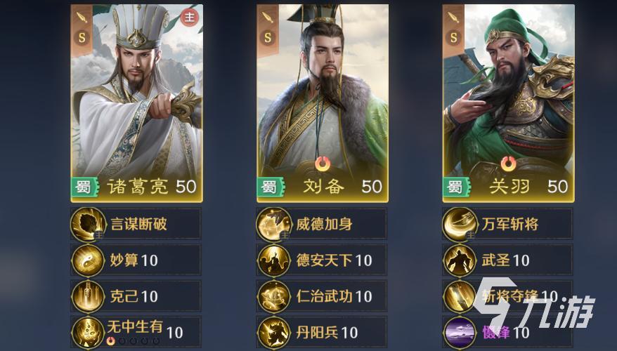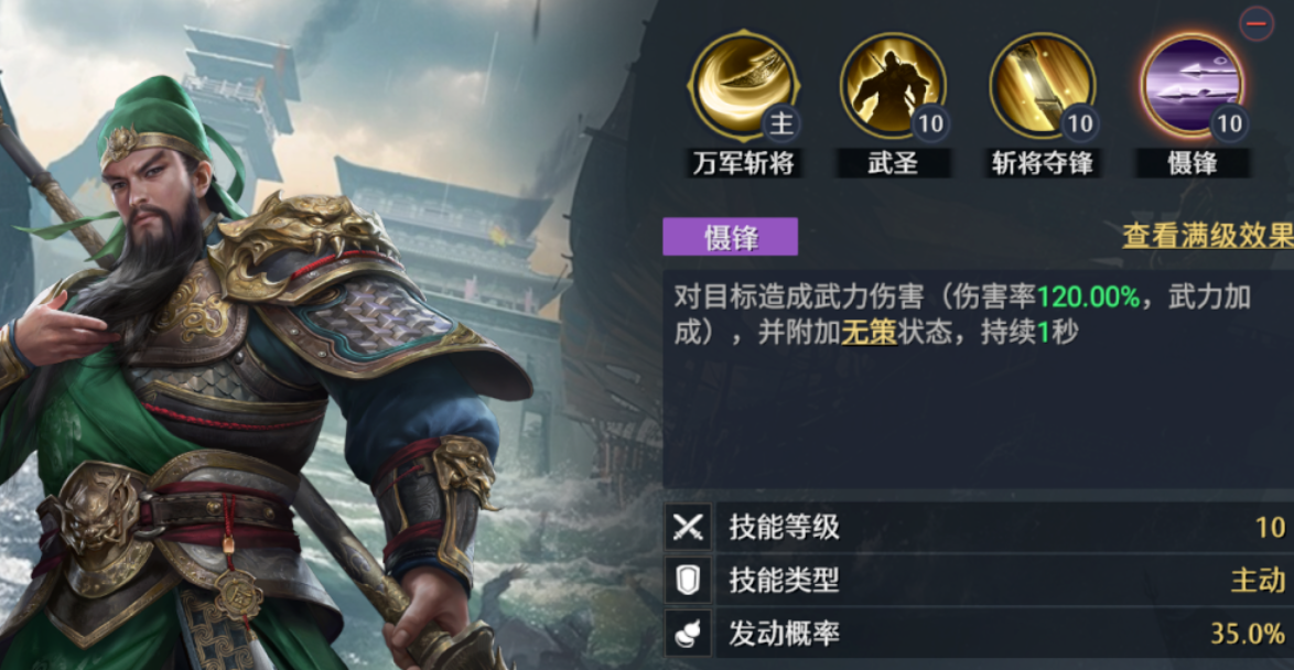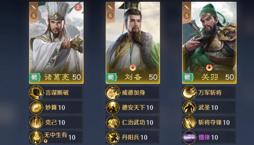 关羽,3号位了,鞋带斩将+慑锋,慑锋(也可以打出沉默效果)可以让关羽在武圣状态带枪兵下额外获得10%发动率,加上兵法中的集智,发动率更是来到了46%,。兵法方面诸葛亮带军略,刘备带励军,关羽带军略。
