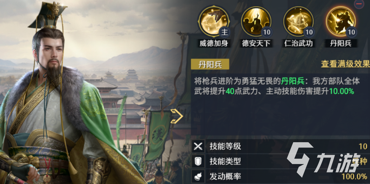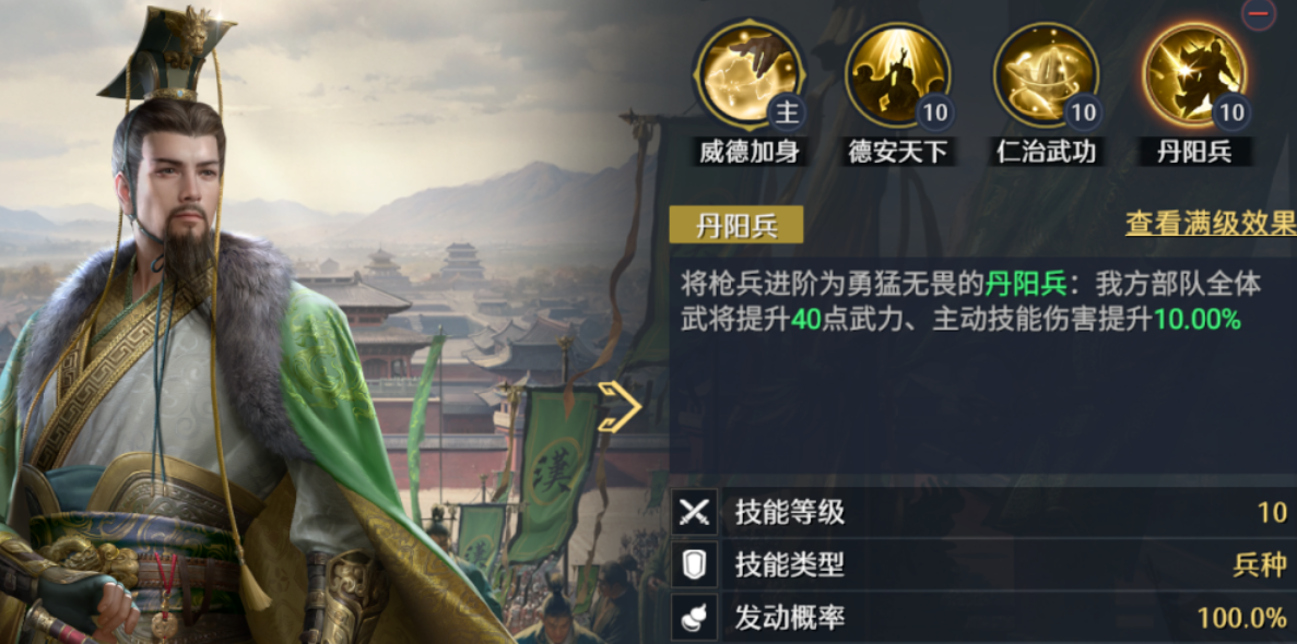 然后2号位用刘备,战法带仁治武功和丹阳兵,之所以带丹阳兵是为了更好地辅助关羽和诸葛亮,为其增伤。丹阳兵是必带的,另外一个技能备选也可以带刮骨或者拒马,刮骨对付周瑜、司马懿很好用,能驱散火毒debuff。拒马则能更进一步拔高诸葛亮和关羽的伤害。
