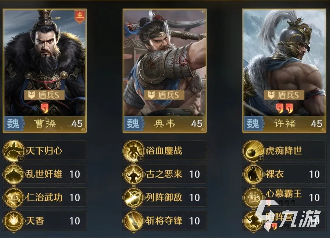 关于他们的技能配置,放在图中。兵法搭配这一块,45级肉盾反甲流就是关键所在,曹操只要疯狂堆砌减伤和治疗效果,典韦和许褚只要注重叠加反伤效果,只要记住这两个重点就可以了。