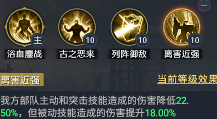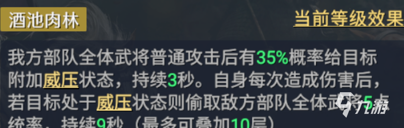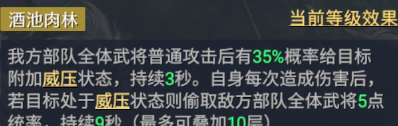 固有战法普攻挂威压,针对威压目标偷取统率,满层50点,这样就是越来越硬,敌人越来越脆。战法配置方面,董卓霸王反戈+陷阵营,提升坦度与恢复。没陷阵或是想补输出,可以用鼓破千雷,反击普攻挂重伤,满3层虚弱敌人,大幅降低其输出。