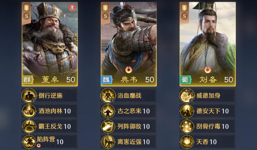 3号位刘备,战法配置刮骨疗毒+天香,可以提供全队常驻12%减伤,以及大量治疗,刘备是目前少有的能做到天香效果常驻的,减伤叠加董卓吸取的统率、陷阵的额外抗性,让整个队伍的坦度非常夸张。