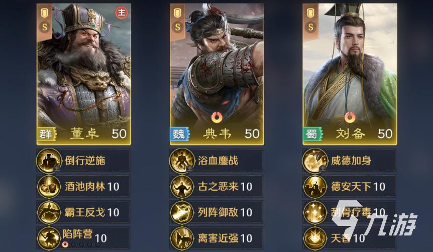 关于九牧之野霸王盾怎么玩大家看完上面的介绍后相信也都知道了,这个配队的下位替代不多,关键性战法陷阵营、天香、反击类的这些都是必带的,兵种自然都是带盾兵,兵法方面董卓典韦刚毅系,刘备励军系。整个队伍差不多有常驻23%的减伤,再加上董卓大招的吸血与统率吸取的差异,让整个队伍宛如一辆泥头车。