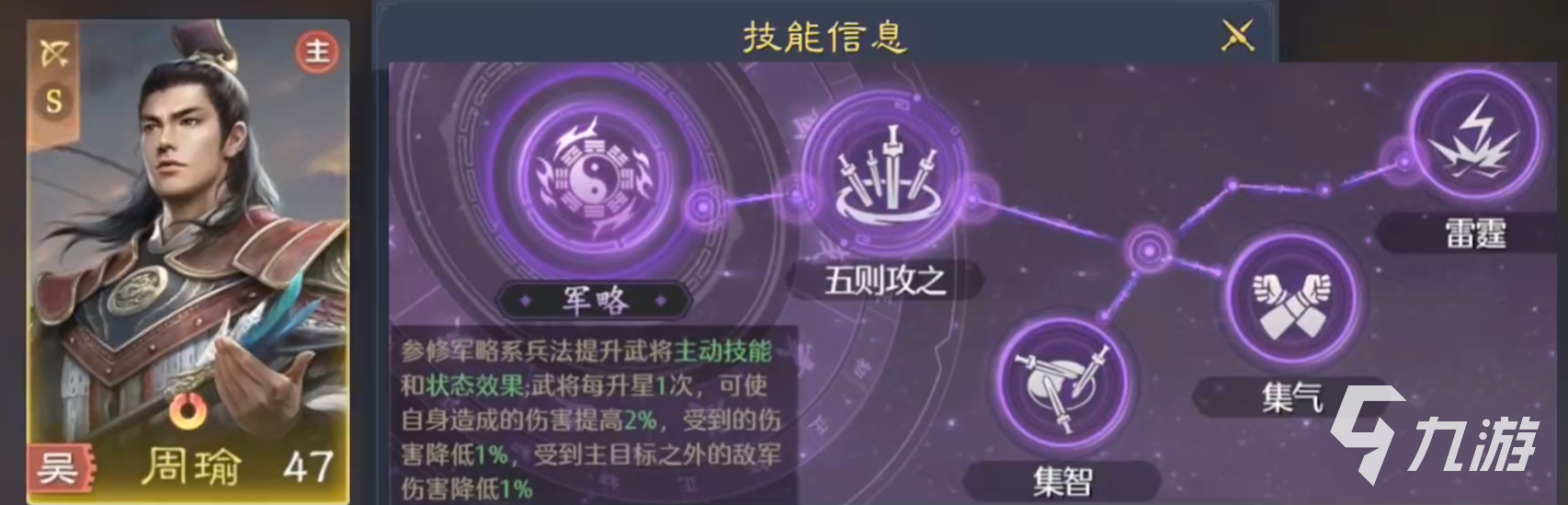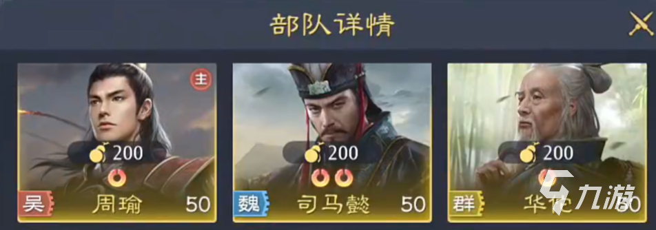 兵种可以去携带能达成3s的盾兵,让每一个都都能额外多30%的属性,军法方面主将周瑜如下图所示,司马懿去带军略、计成得势、集智、善谋和奇谋,华佗带励军、诱敌而击、乐善、奋主和活气。
