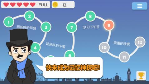 《记忆神探》是一款挑战你的记忆力和注意控制能力的游戏。你需要快速记住短暂呈现的物品,并在随后的测试中找出它们。记忆神探的设计来源于被心理学家广泛使用的工作记忆任务。 ☆ 专注于大脑效率的决定者——工作记忆 ☆ -- 工作记忆能力是决定一个人的认知能力的关键要素 -- 大量研究已发现工作记忆能力可通过适当的训练来提高 -- 更好的工作记忆意味着更好的注意控制能力 -- 更好的工作记忆能力会使大脑的工作效率更高 ☆ 逐渐升高的游戏难度 ☆ -- 很容易上手,但是关卡难度会不断提高 -- 游戏中会出现多种不同的玩法 -- 随着难度的提高,你将会发现你大脑的无限潜力! ☆ 萌系手绘画风 ☆ -- 近百个超级萌的手绘物品等你来挑战 ☆ 一个关于福尔摩斯和你的奇妙故事 ☆ -- 有没有想过要成为一名像福尔摩斯一样的超级神探? 到记忆神探的世界里来实现吧! 所有关卡都是免费的哦!