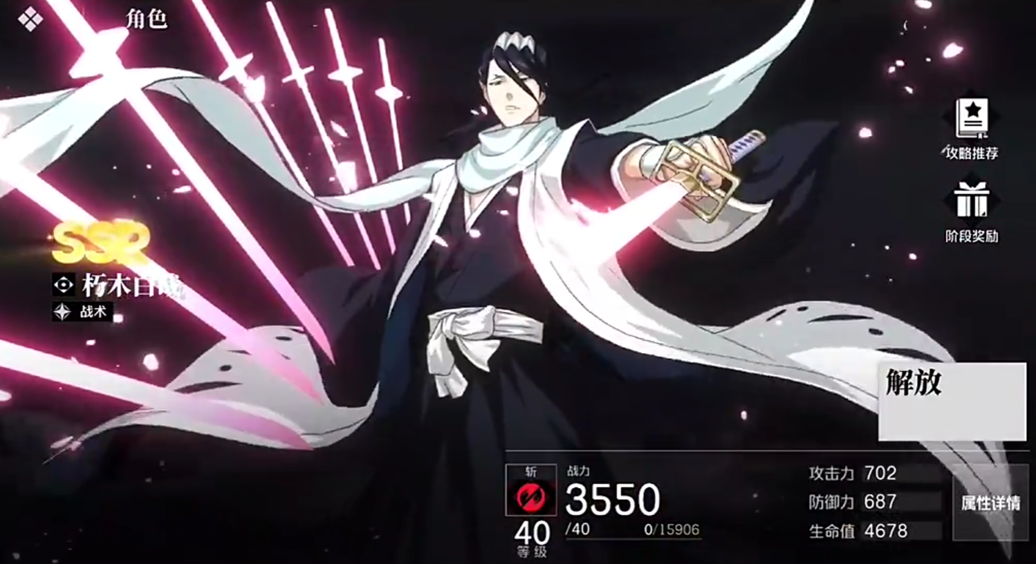 他的必杀会将刀身解放成细刃后,用超快的速度发动攻击,并进入到卍解状态,强化普攻和战技,他的战场技会将飘在空中的花瓣凝结成刀刃,同时将敌人刺去,并将其钉在地面之上,总得来说他是一个强大的战术支援,可以保持高频率的后台输出,还能降低敌人抗性,兼具队伍强化和爆发伤害的优势。