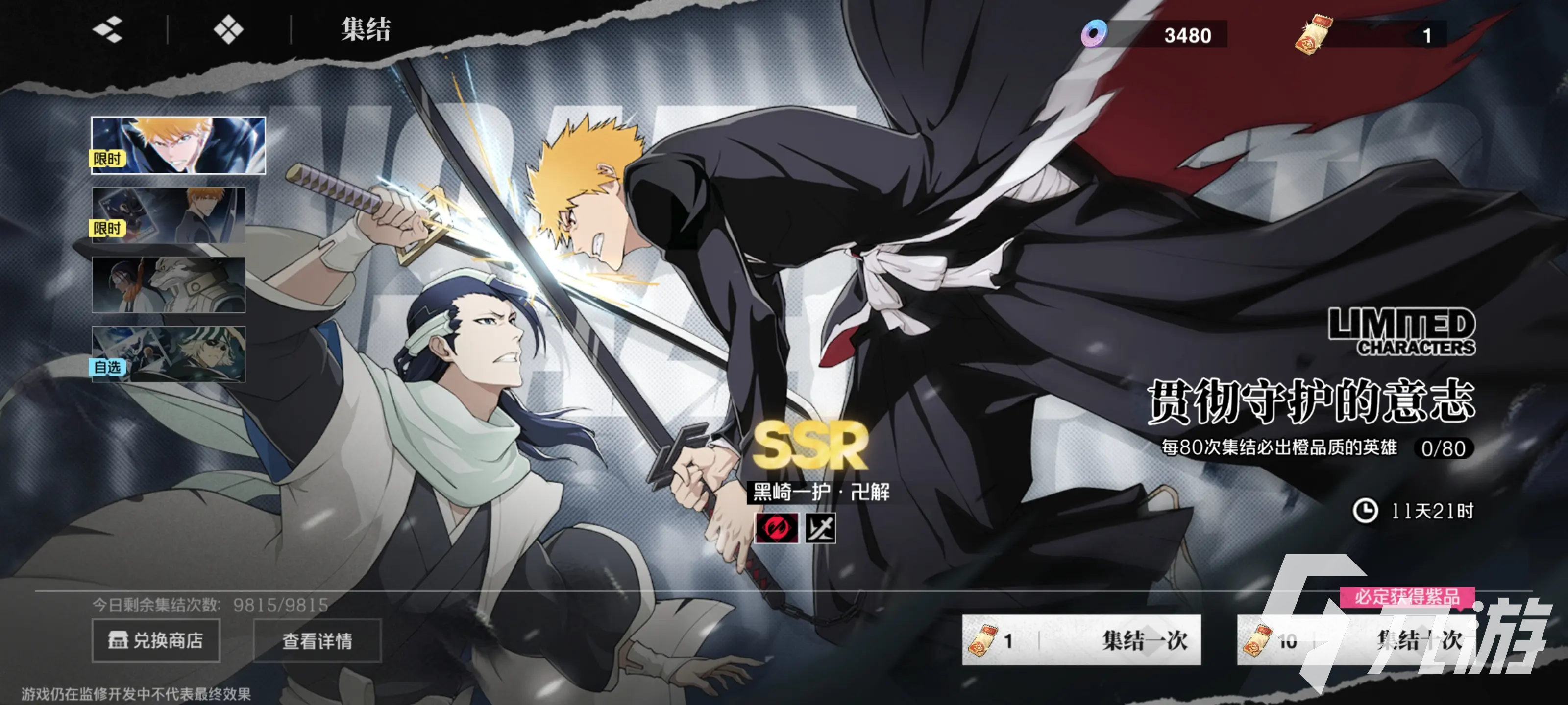 还有个比较重要的池子,可以在常驻池结束后进入,那就是限定,这个时期,比较重要的就是多多获取强势角色,丰富英雄池,”卍解”黑崎一护就非常强力,对单体输出能力很强,适宜挑战BOSS之类的强大对手,显著提升战斗效率,战斗表现优秀。