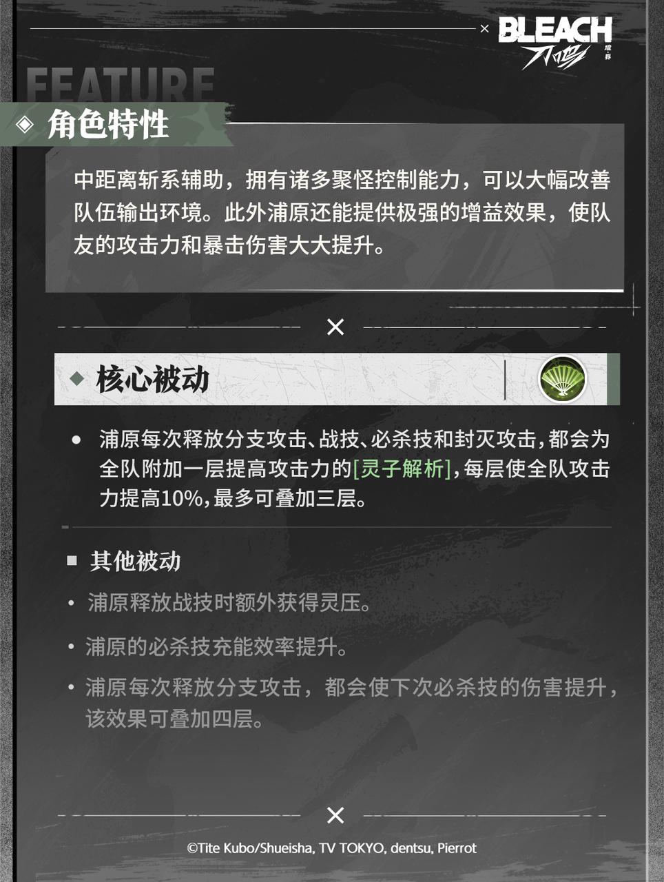 游戏中的浦原喜助是中距离斩系辅助角色,战技可以控制并聚集敌人。必杀技在造成伤害的同时还可以提升全队暴击伤害,是斩系队不可或缺的强力辅助。