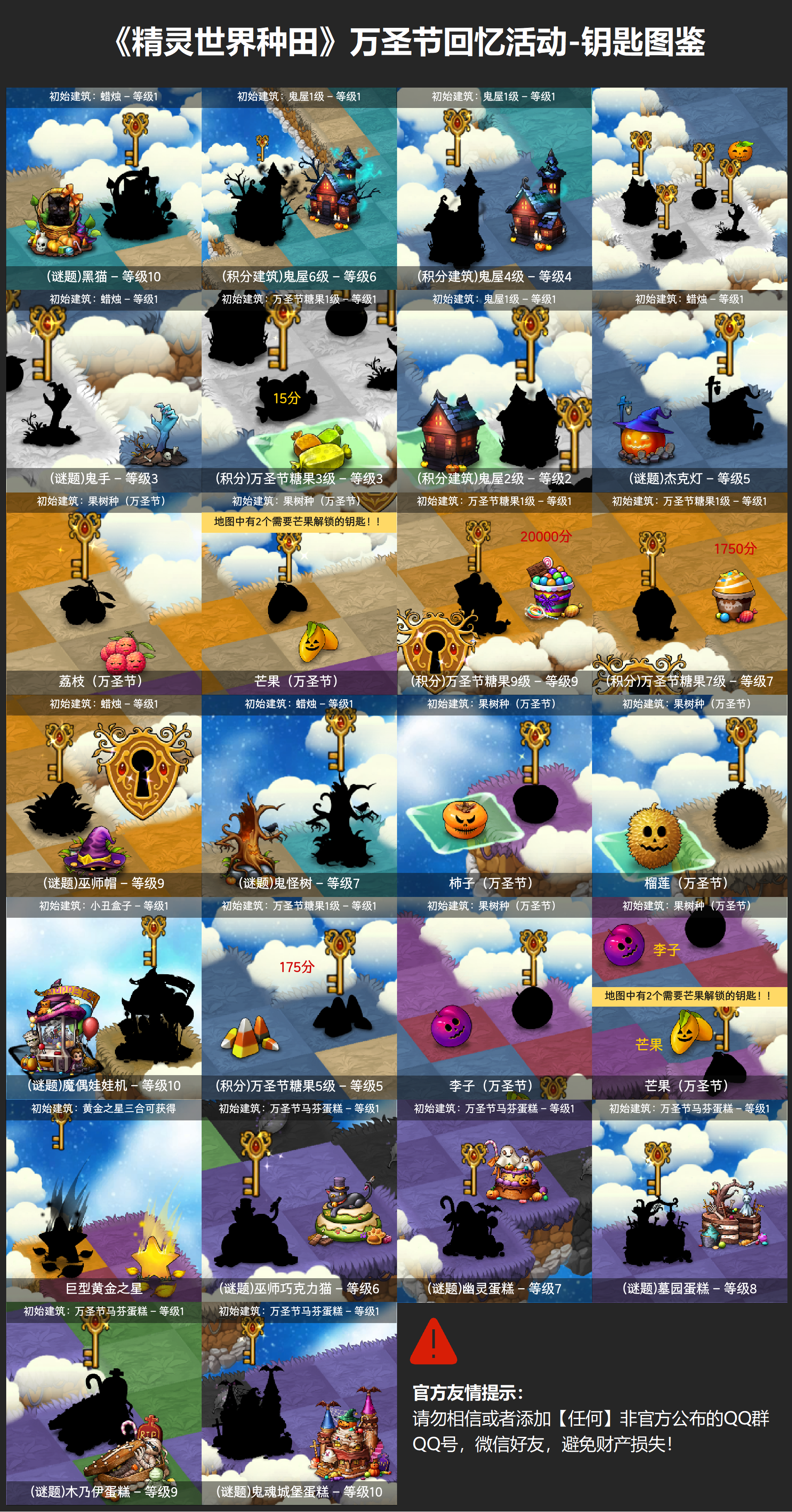 本周五将会开启大型活动【万圣节回忆】,每年只开一次哦,小伙伴们千万不要错过,活动中可以白嫖大量的金叶、石材、宝石、万圣节主题精灵等资源,总之是咱们游戏绝对不能错过的活动之一,活动详情如下: