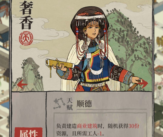 奢香擅长:建造奢香的天赋是建造时获得随机资源,专属天赋是升级建筑额外获得菜肴,那么就比较适合刷小建筑给严大人兑换,在开荒的时候也好用。