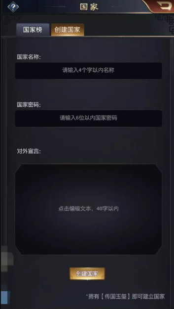 但是,该如何创建国家呢,真是瞌睡了就来枕头,点击选择创建国家,输入大人们自己内心所想命名的国家名,另外可以设置好相应的密码保证国家稳定。另外,还需要一项很重要的东西——传国玉玺。目前暂未有获得该道具的途径,官官也是多次咨询,奈何技术大大兜着底子,神秘的笑容让官官颇为无奈。
