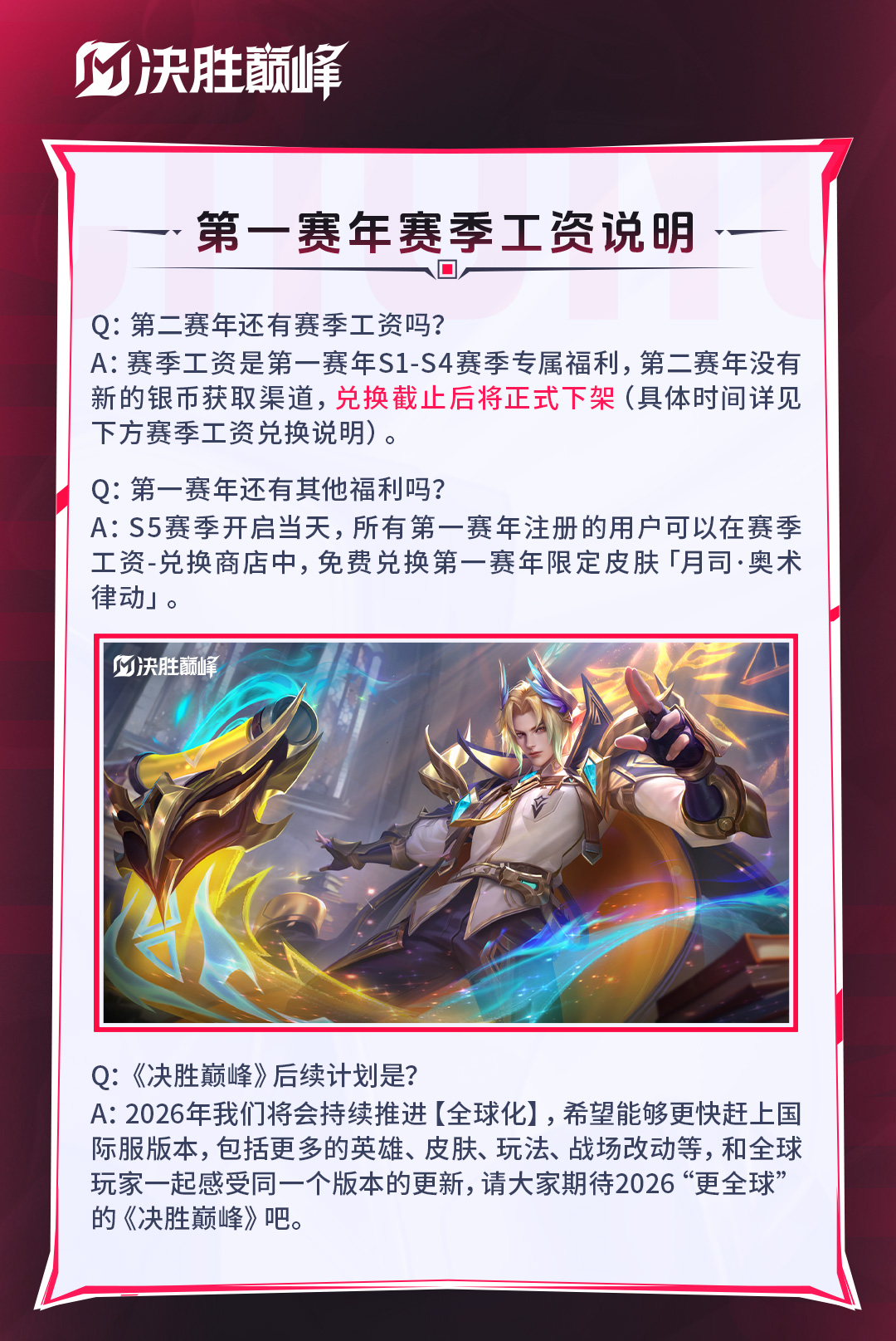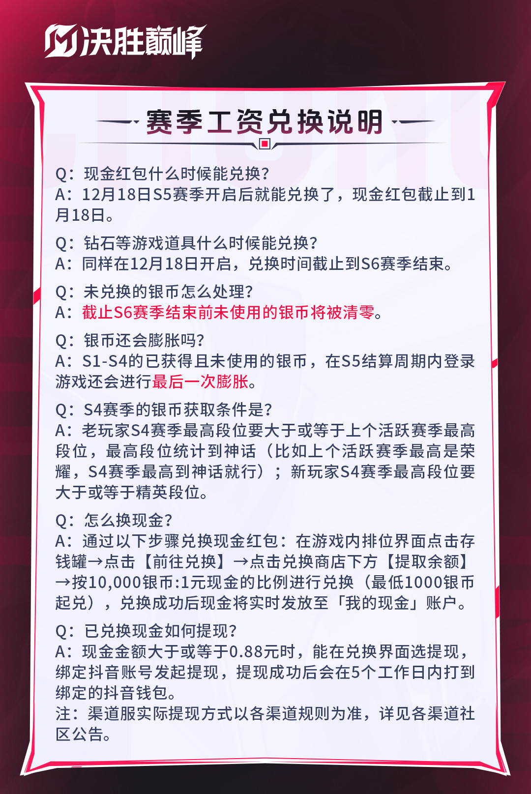 《决胜巅峰》将于2025年12月18日更新S5赛季,赛季工资将同步开启兑换,进行最后一次赛季工资结算。