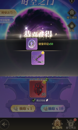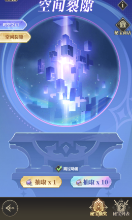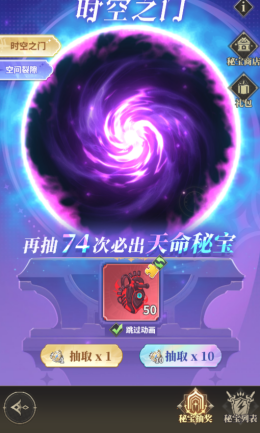 秘宝激活后对战力提升相对较高,秘宝抽奖中的时空之门消耗神迹罗盘获得秘宝碎片