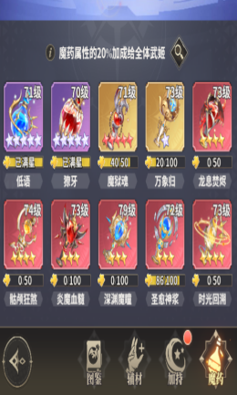 每个魔药达到一定的星级可以选择11星以上的舞姬进行加持,加持后该舞姬在战斗中获得当前魔药的属性,魔药星级越高可加持舞姬越多。