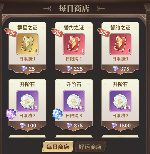 图中所示为每日必买。同时好运商店内刷出的誓约之证与挑战券在钻石允许的情况下也需要购买。