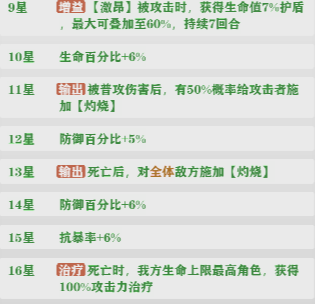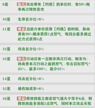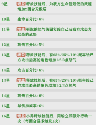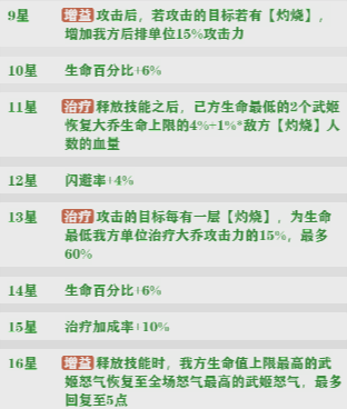 大乔在攻击有灼烧的对手武姬可以为我方后排武姬增加攻击力。释放技能可以根据对方所有武姬的灼烧层数为我方血量最低的两个武姬增加血量。且我方血量上限最高的武姬回复至我方本回合怒气最高的武姬数量怒气。最多回复至5点。