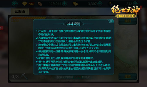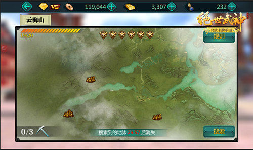 《绝世武神》手游在传统卡牌游戏模式的基础上加入了很多创意玩法,比如今天我们要解读的云海山系统。云海山,云海宗大本营,拥有丰厚的灵脉秘宝。在游戏中当玩家战队等级达到28级时开启云海山系统,玩家可以在其中搜索并开采铜矿和金矿,当然前提是你能顺利击败矿脉看守,获取大量财富。搜到的矿脉分为不同星级,星级越高资源产出的速度就越快,攻取难度就越高,搜索到的矿脉30分钟后会消失,所以需要尽快占领。