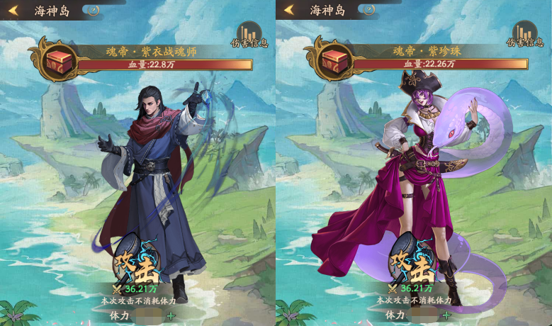 魂师战斗:听说海神之心引得各方魂师远渡前来,碎片争夺看来是在所难免;而海神岛上的海魂师也绝不会让你轻易通过,掌柜可要做好迎战准备!