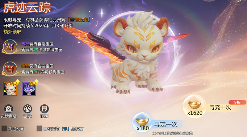 限定寻宠·虎迹云踪开启,全新灵宠翡翠云虎(初始5魄石)、雷虚子 (初始3魄石)登场,少侠可通过 「虎迹云踪」限定寻宠可以获得。玄武真君、玲珑羽兽进入万象聚灵寻宠。
