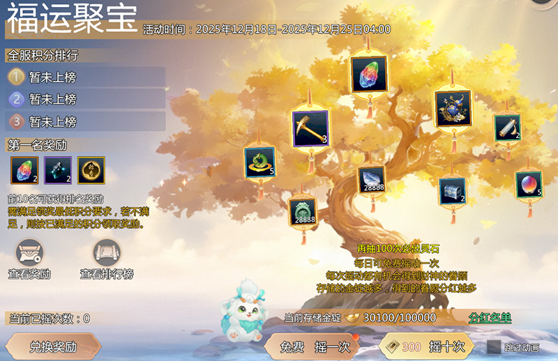 福运傍身,聚宝活动开启,参与玩法有机会摇出潜龙锥、岁华葫芦、万象灵石等惊喜道具,登上摇钱树排名更有机会获特殊称号、蒙尘的定敕符章(八阶)等额外好礼!