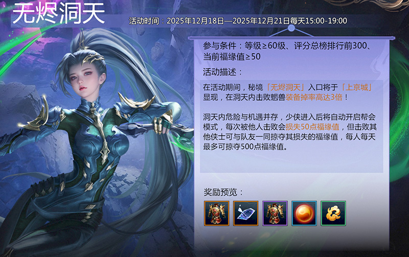 秘境「无烬洞天」开放,洞天内消耗福缘击败魍兽装备掉率为普通地图的3倍!但少侠若不幸被他人击败,则会被掠走福缘值,机缘与风险并存,亟待少侠前来一探究竟。