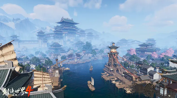 首先是无限地图,正如游戏标题所示,新作再现宋韵国风的无限地图。以从宁静的桃溪村扬鞭启程,骑马御雕直奔繁华的临安王城,再一路驰骋至神秘的星月海,只要你有耐心全程无缝衔接,没有一丝加载等待的打断,颠覆了传统mmo那种传送过场式跑图的繁琐。站在临安城楼远眺,月儿峰与明月辉映,湖面商船货载往来都清楚。支持120帧、真实皮肤渲染、延迟渲染等新技术,视觉体验这一块提升显著。