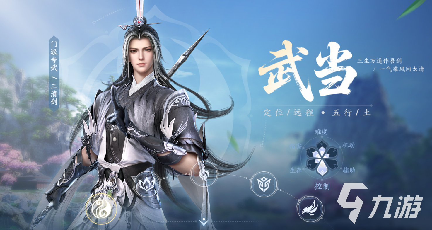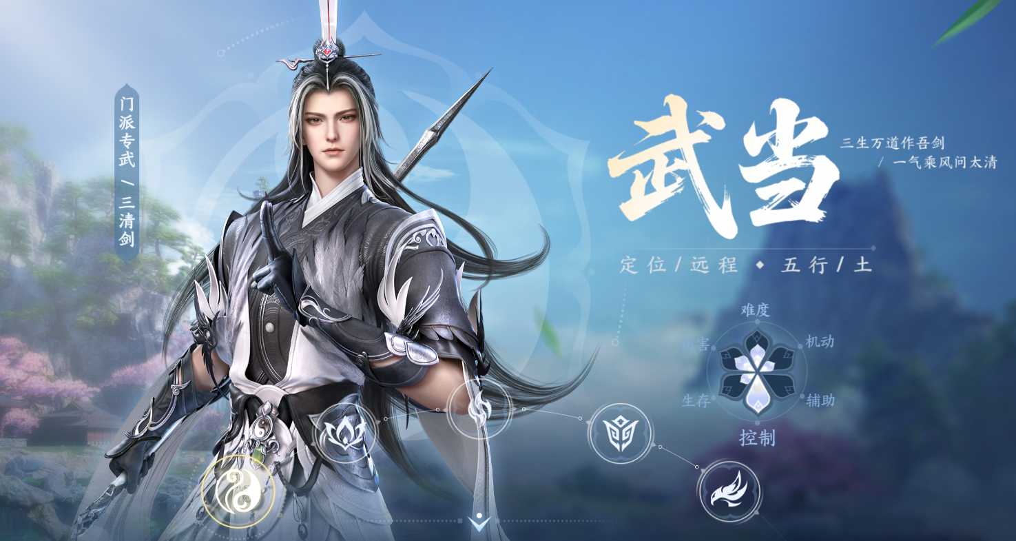 首先是武当,是个道心剑骨,清逸出尘的门派,使用“三清剑”的专武,是远程控制的代表人物,擅长免疫敌方控制,而且拥有多种位移手段,整体身形漂移潇洒,在战斗中灵活机动,可灵活规避伤害,比擅长使用八卦阵,他们的属性为土。