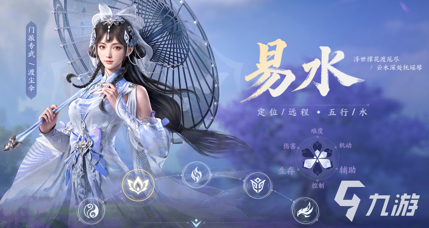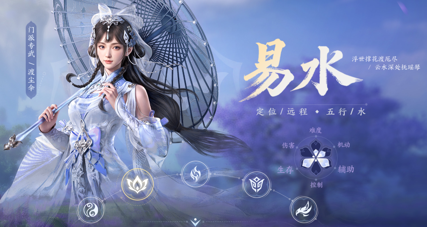 其次是易水,水属性门派,“渡尘伞”为该门派专武,也是远程角色。各个都悬壶济世,医者仁心,更为擅长辅助,在队伍中不可或缺,在战斗当中,主要通过伞对友方施加群体治疗和增益效果,治疗能力出众,可提高队伍续航和生存,给队友保驾护航。
