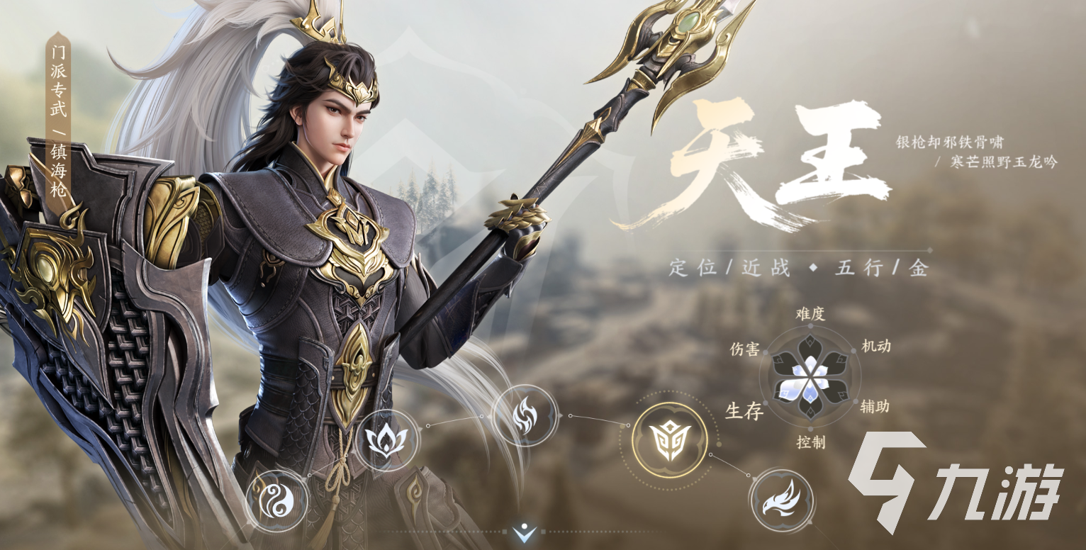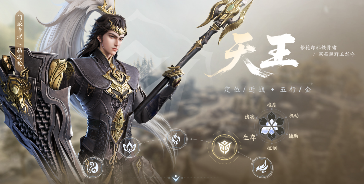 第三种是天王门派,他们具有帅气刚毅的面庞,五行属金,是枪盾合一的战斗体系,在战场上可谓铜墙铁壁的存在,更偏向于战士,“镇海枪”这种重型武器是他们的专武,攻防一体,善于冲锋陷阵,是前排的核心,不仅能吸收高额伤害,还能打乱对手阵型,给队友创造更好的输出机会。