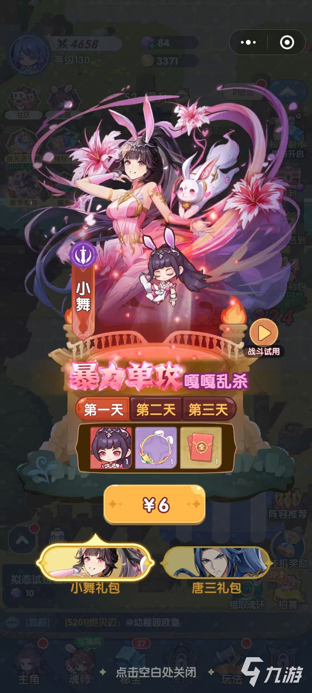 这套阵容对于微氪玩家来说,成型难度并不高。相比某些需要依赖高抽卡运气的强力阵容,史莱克七怪速推流是相对获取容易的。新手阶段,首先推荐购买6元的小舞礼包和30元的唐三礼包,仅需36元就能立即获得双核心输出,为阵容奠定基础。接着再开一个68元的魂师基金,总计能获得180个招募水晶。