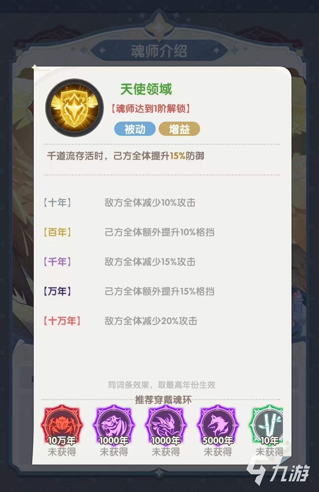 第1个被动天使领域,只要千道流存活,己方全体就能够获得高额属性加成,包括防御加成,减少敌方全体攻击力,增加全体格挡等。这个被动是千道流的核心被动,对于整个团队都是有效的加成,削弱对方攻击增加了己方防御,让后排可以更好地输出。第2个被动天使护佑在。自身回合释放附加20%最大生命值的护盾护盾持续两回合冷却5回合。提升魂环年限后,还可以给全体队友附加护盾,在释放技能后增加自身的最大防御值。能够给全体添加护盾,是保护团队后排和辅助的重要方面,这也是千道流成为很多阵容中首选前排的原因所在。